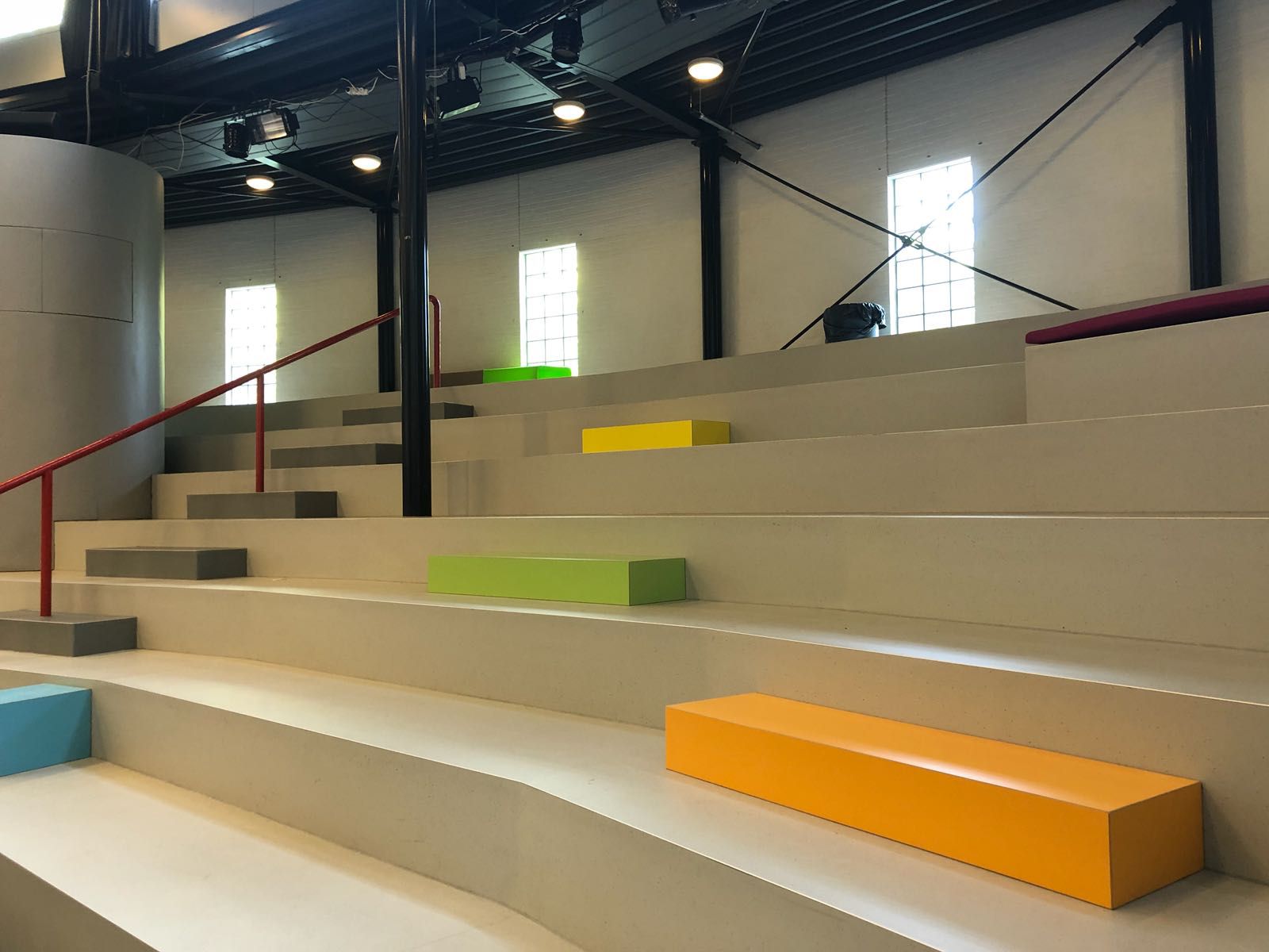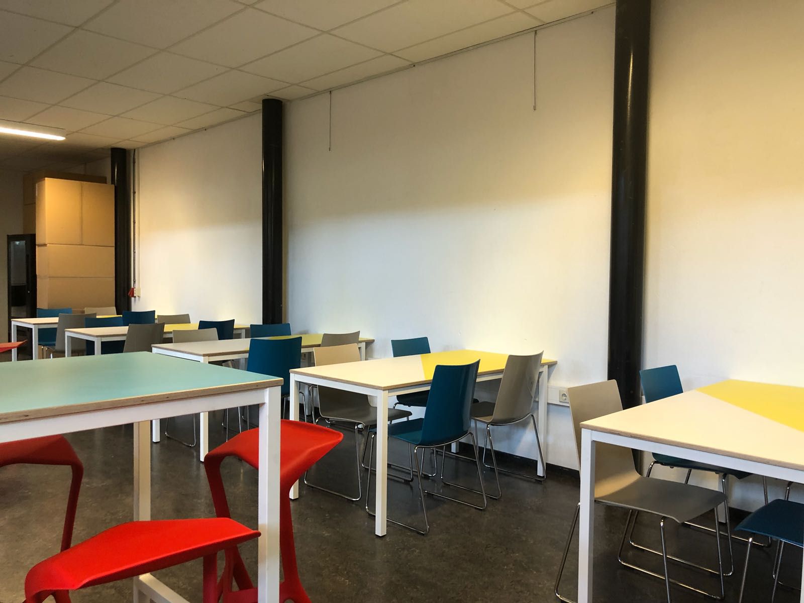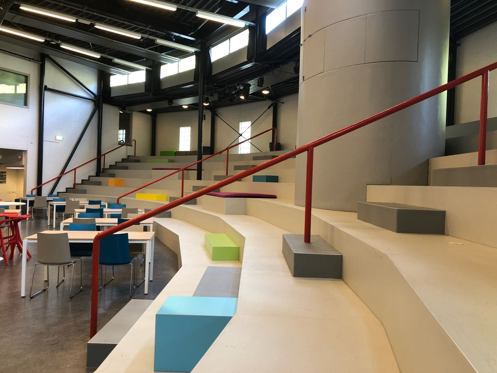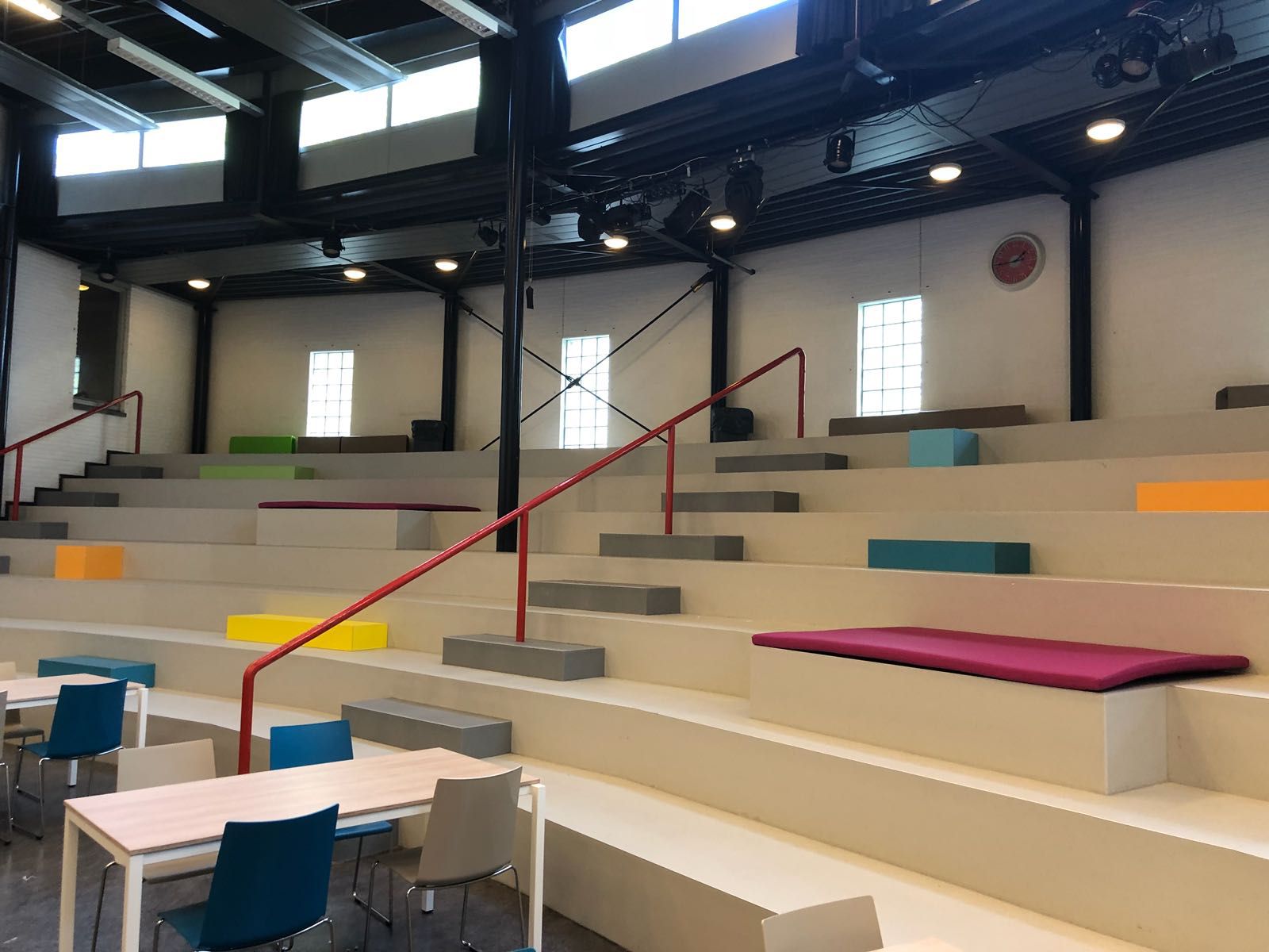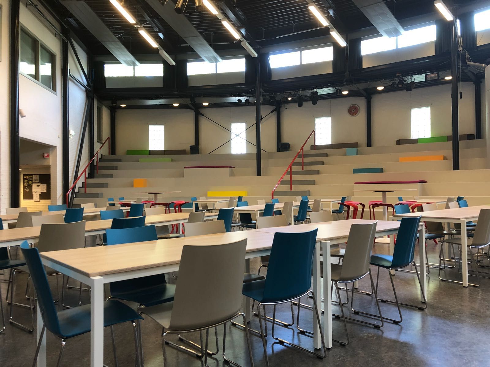 Bij het Schoonhovens College hebben wij een ontwerp gemaakt voor de aula. Met spelende kleuren hebben we kubussen en zitkussen geplaatst op de grote trappen, zo komt er meer kleur terug in de ruimte. Op de vloeren staan nieuwe tafels en stoelen waar veel leerlingen een plekje kunnen vinden in de pauzes en tussenuren.